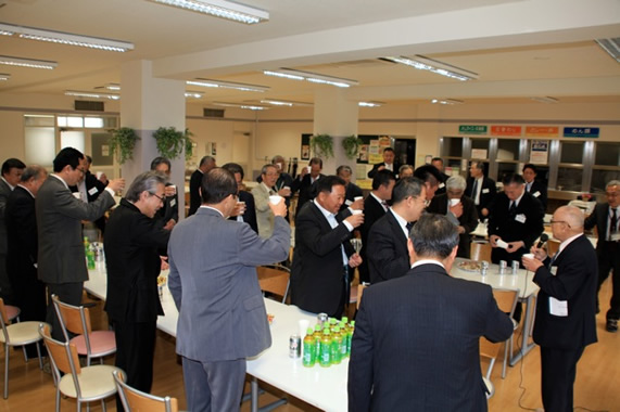 引き続き、15時30分より懇親会を2階大食堂に移して開催(希望者32名)。 中本新副会長(昭和53年卒)兼組織事業委員長に就任の進行で、本会の緊張感とは裏腹に、各位思い思いの近況報告や高校時代の懐かしい話に時を忘れながらも、17時30分に解散しました。